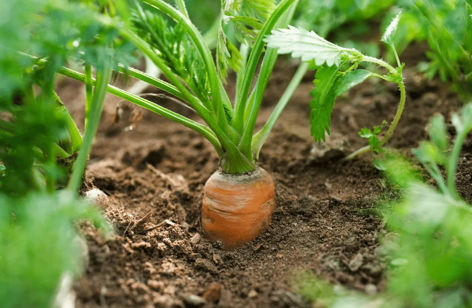 1. Верхушка: верхняя часть моркови немного выступает из почвы или находится на уровне грунта, и корнеплод выглядит крупным и плотным.